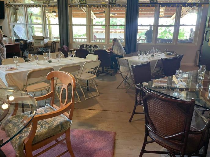 The CLASSROOM Seats 45 for dining. The space Includes a large covered deck with a pool table and a balcony view over the elevated outdoor covered stage.